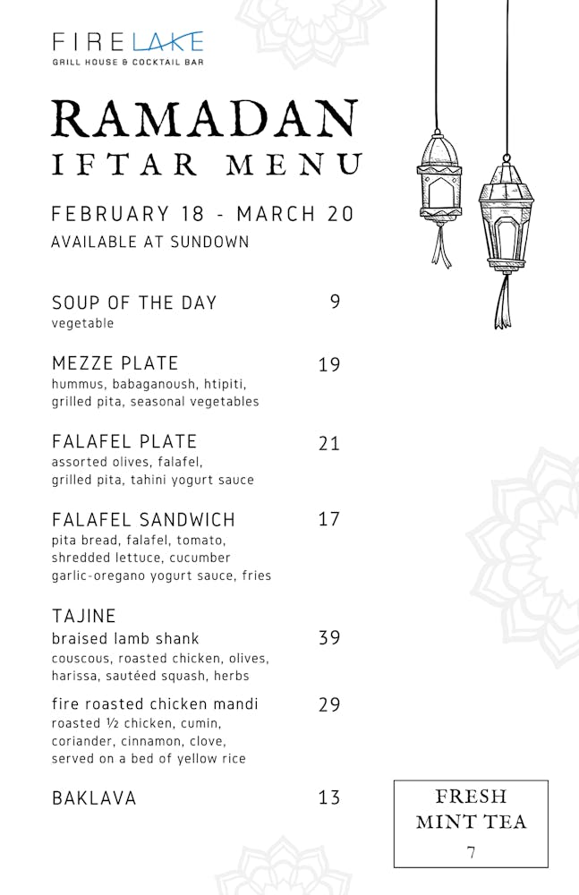 FireLake is proud to honor the traditions of Ramadan and provide a cherished dining experience for those looking to mark the occasion with a dinner out, or those who prefer to not cook after a day of fasting.