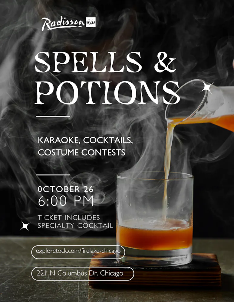 Join us on Saturday October 26th at 221 Blu Bar & Lounge, located in the Radisson Blu Aqua Hotel, as we transform the space into a magical realm where costumes, cocktails, and karaoke come together for an unforgettable evening.